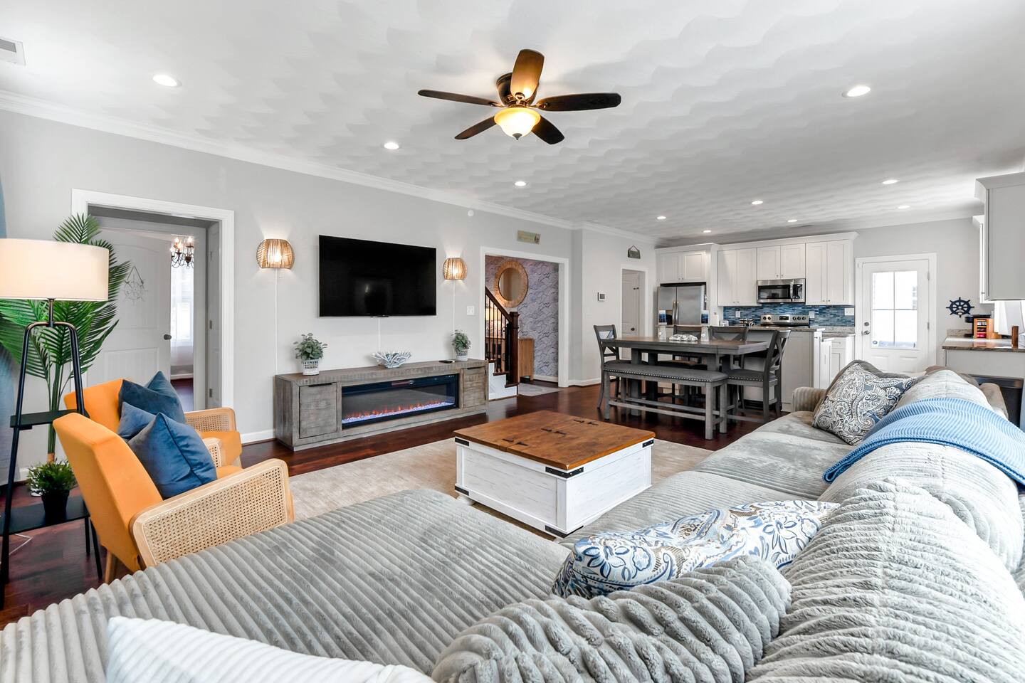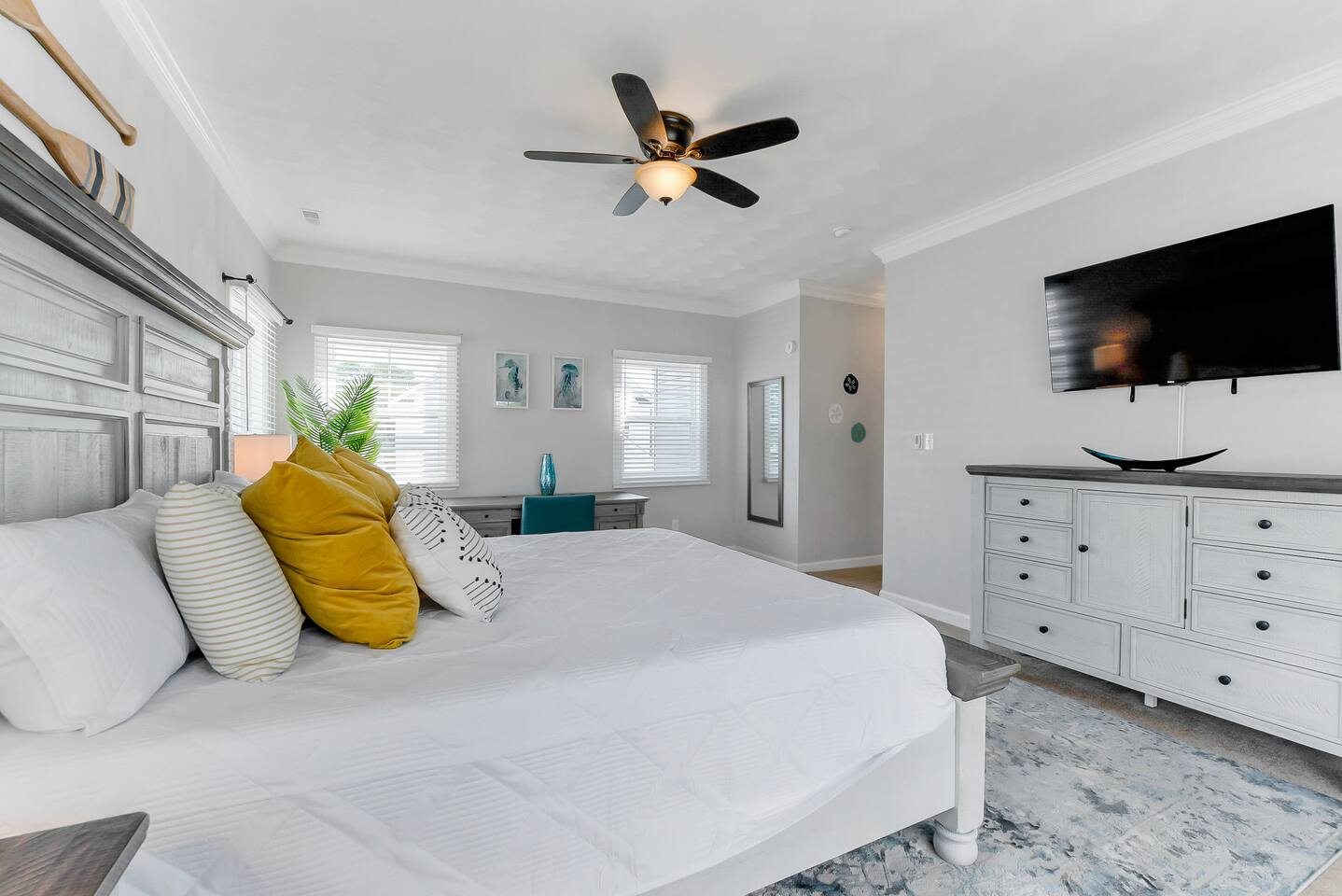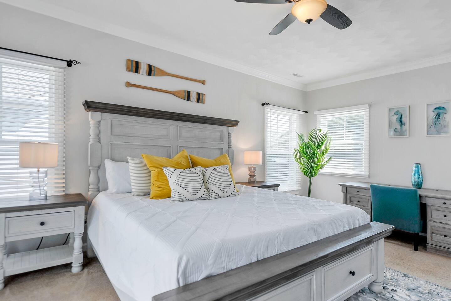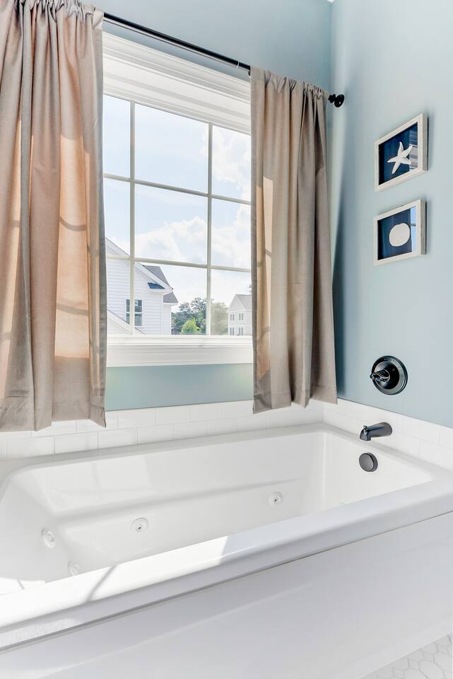 Beach days made easy! Walk into a spacious 5-bedroom retreat with 9 comfy beds, fast Wi-Fi and a full kitchen. 1 King, 1 Queen, bunk & twin options – perfect for groups 5-minute stroll to the sand BBQ grill, fire-pit & fenced yard for family fun Smart TVs in every room, dedicated workspace Minutes to Bay Oaks Park, Eagle Haven Golf Course and local eateries. Book now for stress-free coastal living!