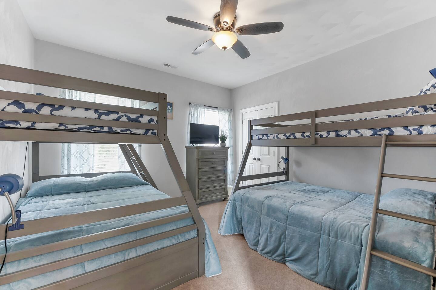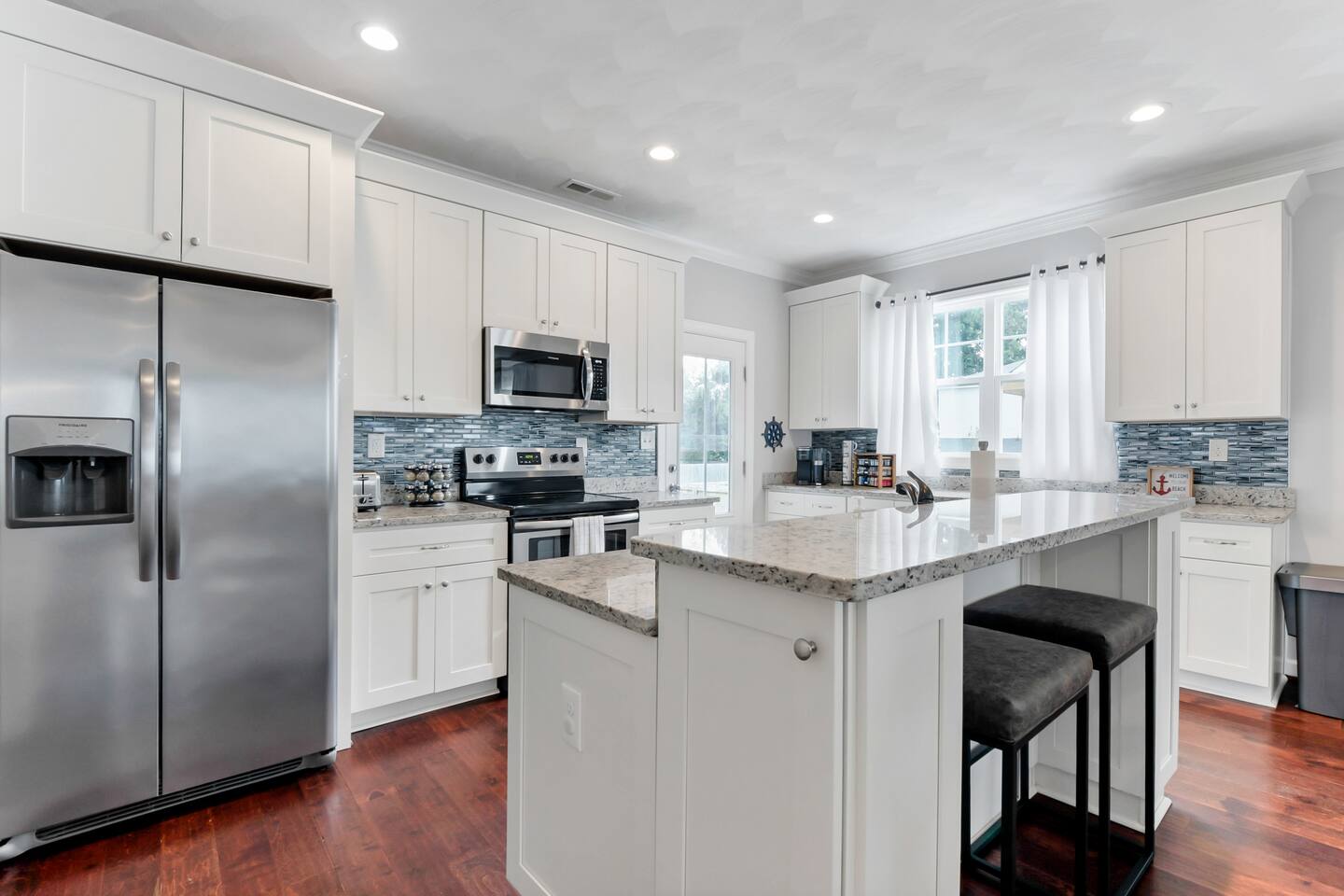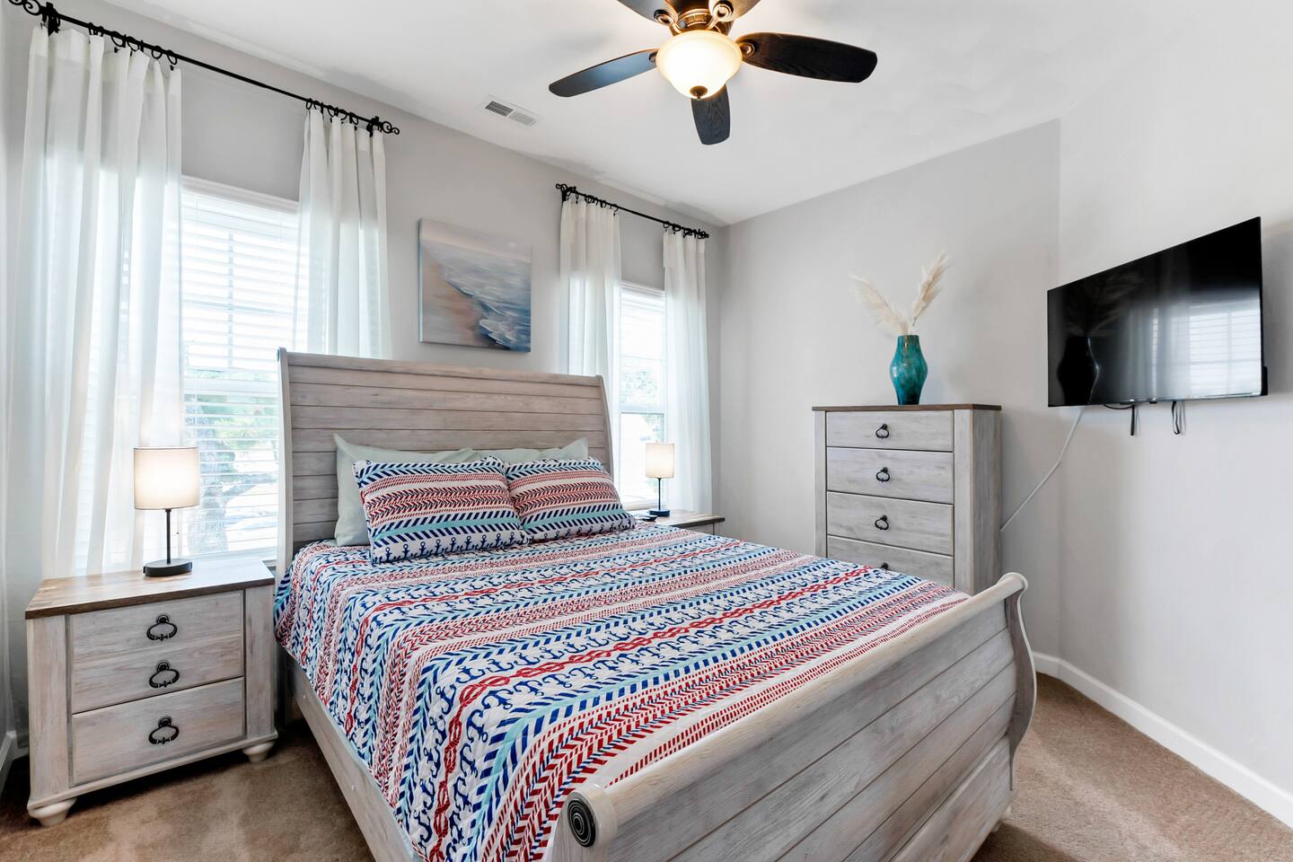 Beach days made easy! Walk into a spacious 5-bedroom retreat with 9 comfy beds, fast Wi-Fi and a full kitchen. 1 King, 1 Queen, bunk & twin options – perfect for groups 5-minute stroll to the sand BBQ grill, fire-pit & fenced yard for family fun Smart TVs in every room, dedicated workspace Minutes to Bay Oaks Park, Eagle Haven Golf Course and local eateries. Book now for stress-free coastal living!