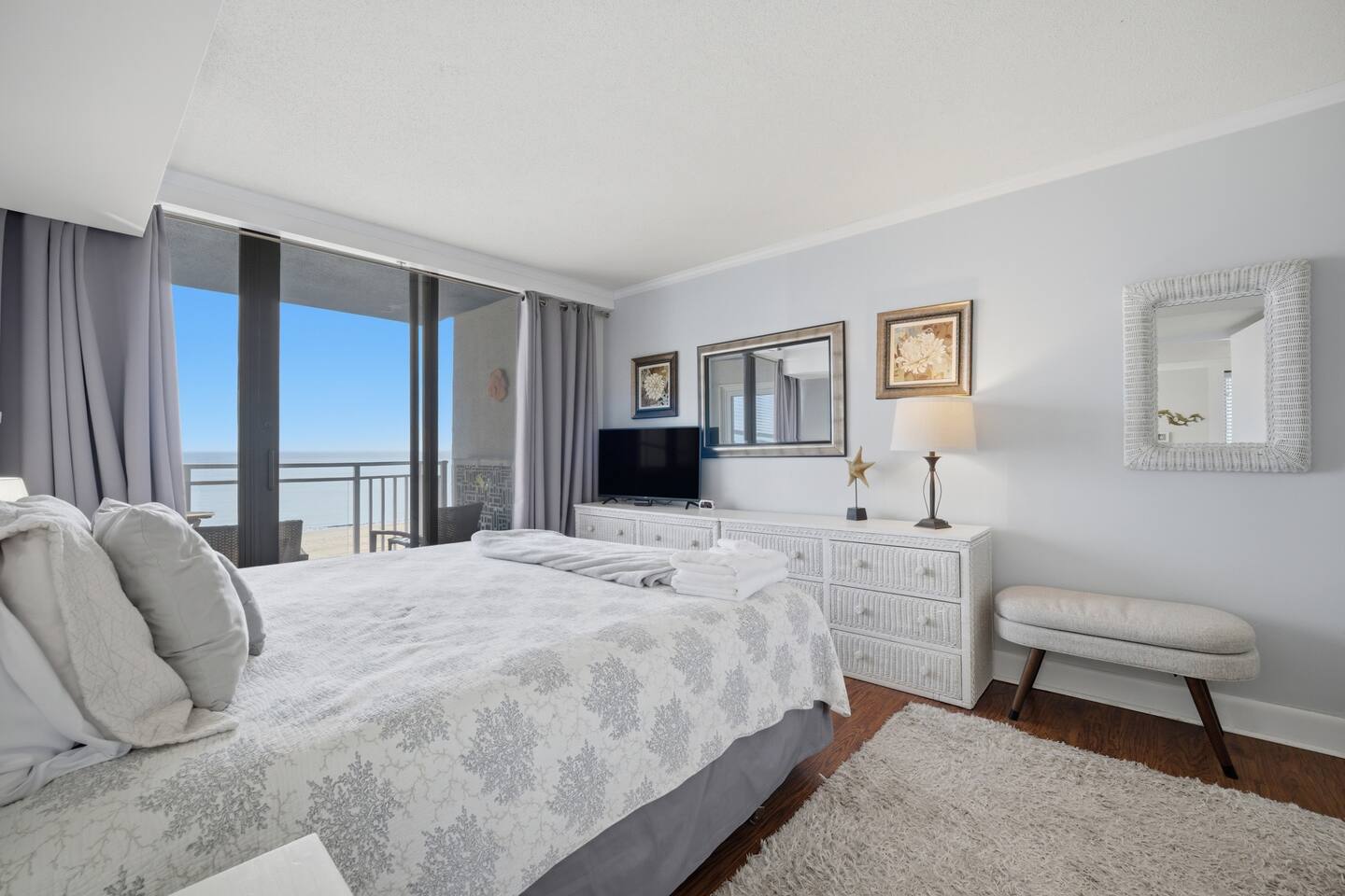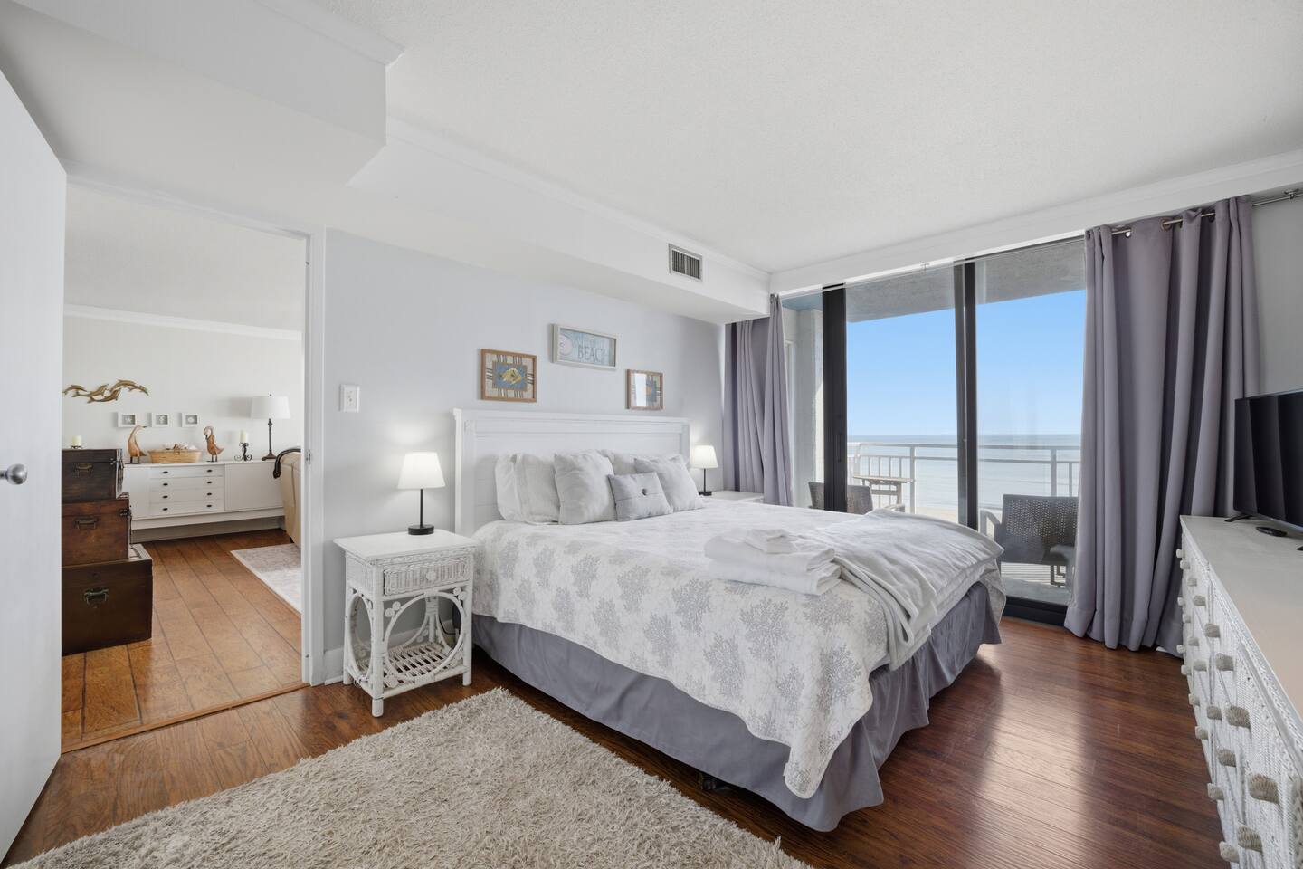 Wake up to the sound of the ocean and step onto your private balcony to take in sweeping views of the Virginia Beach coastline. This bright and airy oceanfront condo is designed for relaxation, with natural light pouring through large windows and inviting you to unwind after a day by the water. Inside, you’ll find an open living space perfect for gathering, a full kitchen for preparing meals, and a dining area for shared moments. The two-bedroom layout offers comfort and privacy, complemented by two full bathrooms for convenience. Sleeping arrangements: - Bedroom 1: 2 full beds - Bedroom 2: 1 king bed Whether you're enjoying morning coffee with ocean views or winding down after a beach day, this space is all about easy coastal living—perfect for making lasting memories by the water.
